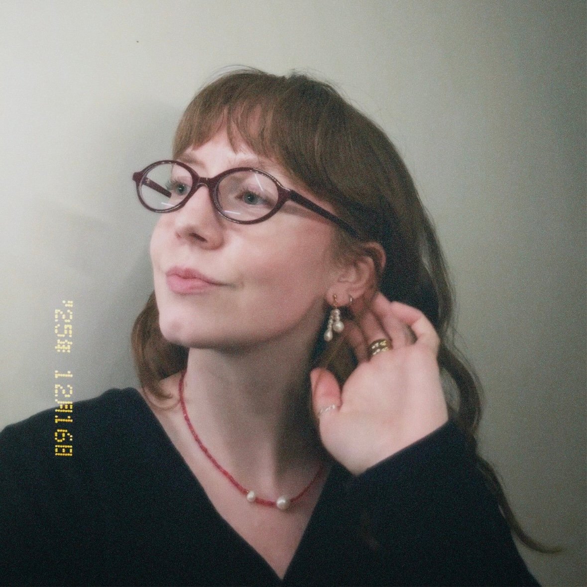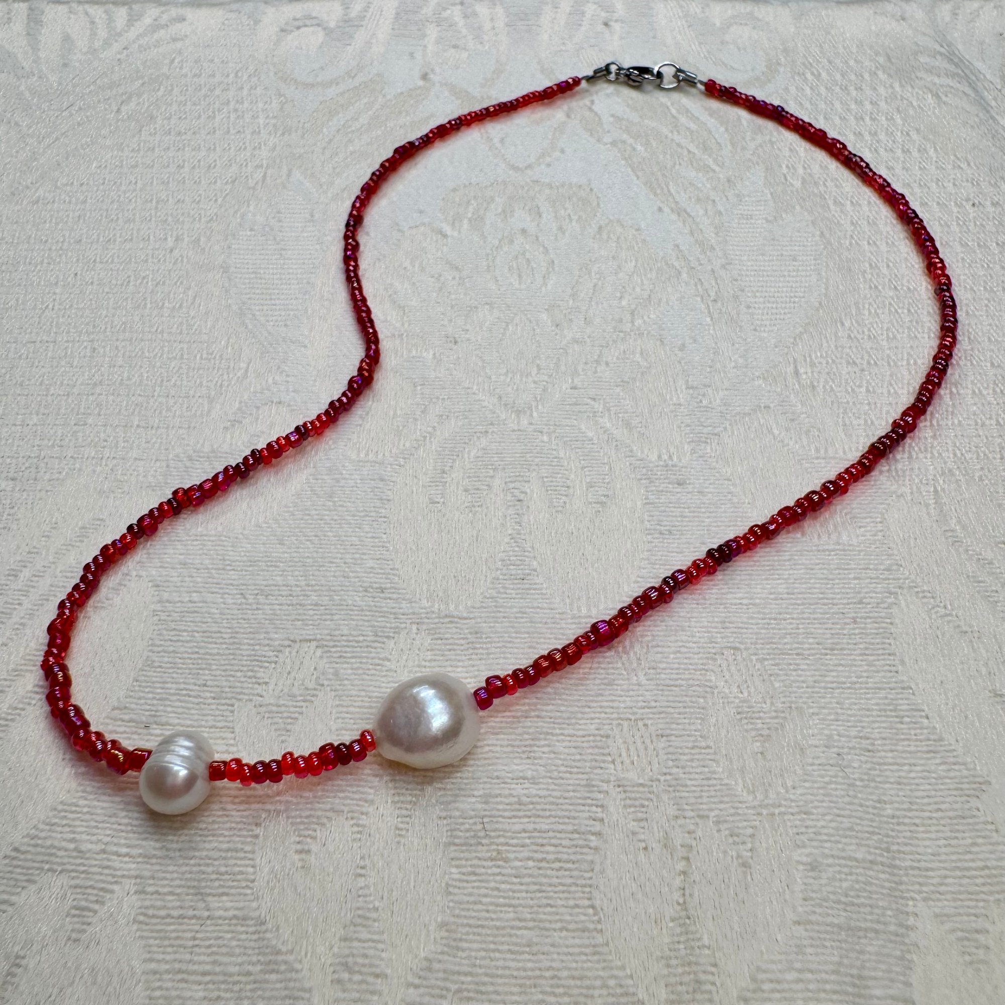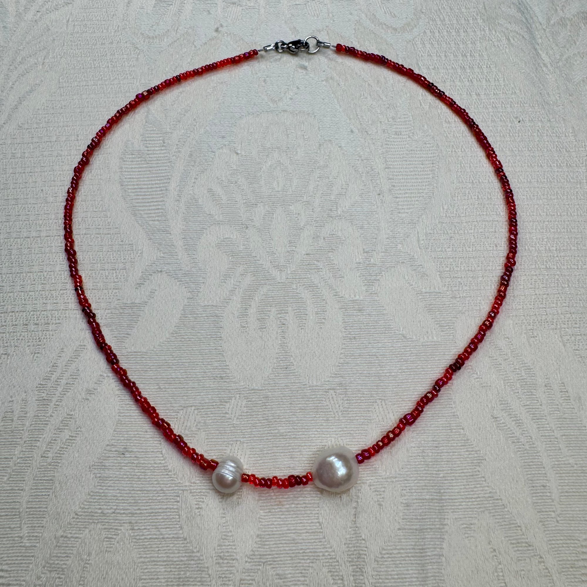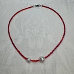 16-inch necklace made with secondhand red seed beads and freshwater pearls.