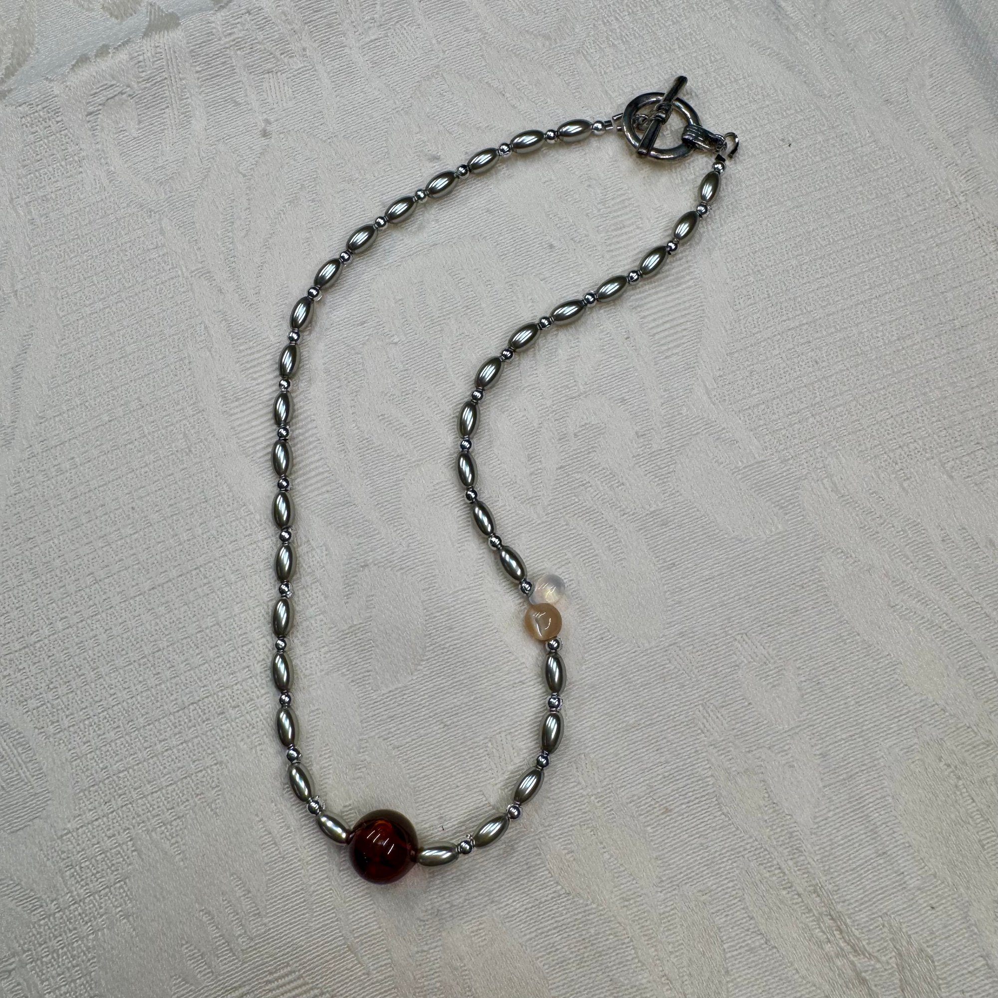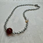 16-inch necklace made with secondhand silver, opal, sand, and tortoise-style glass beads.