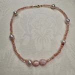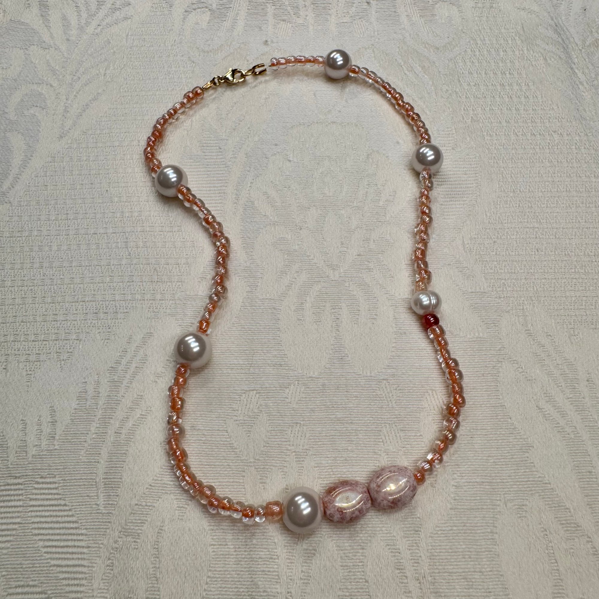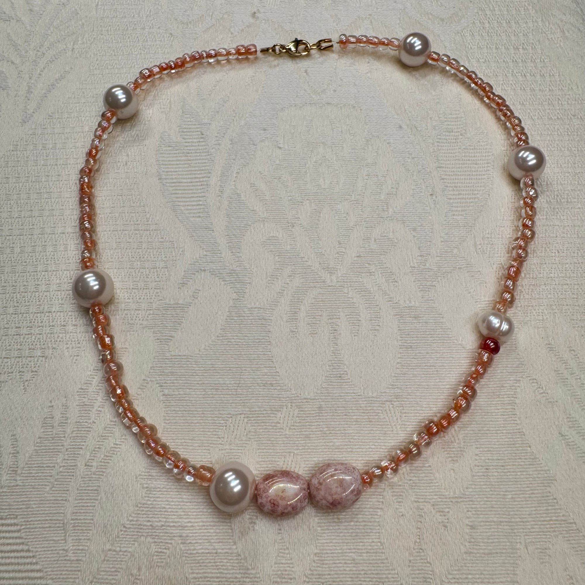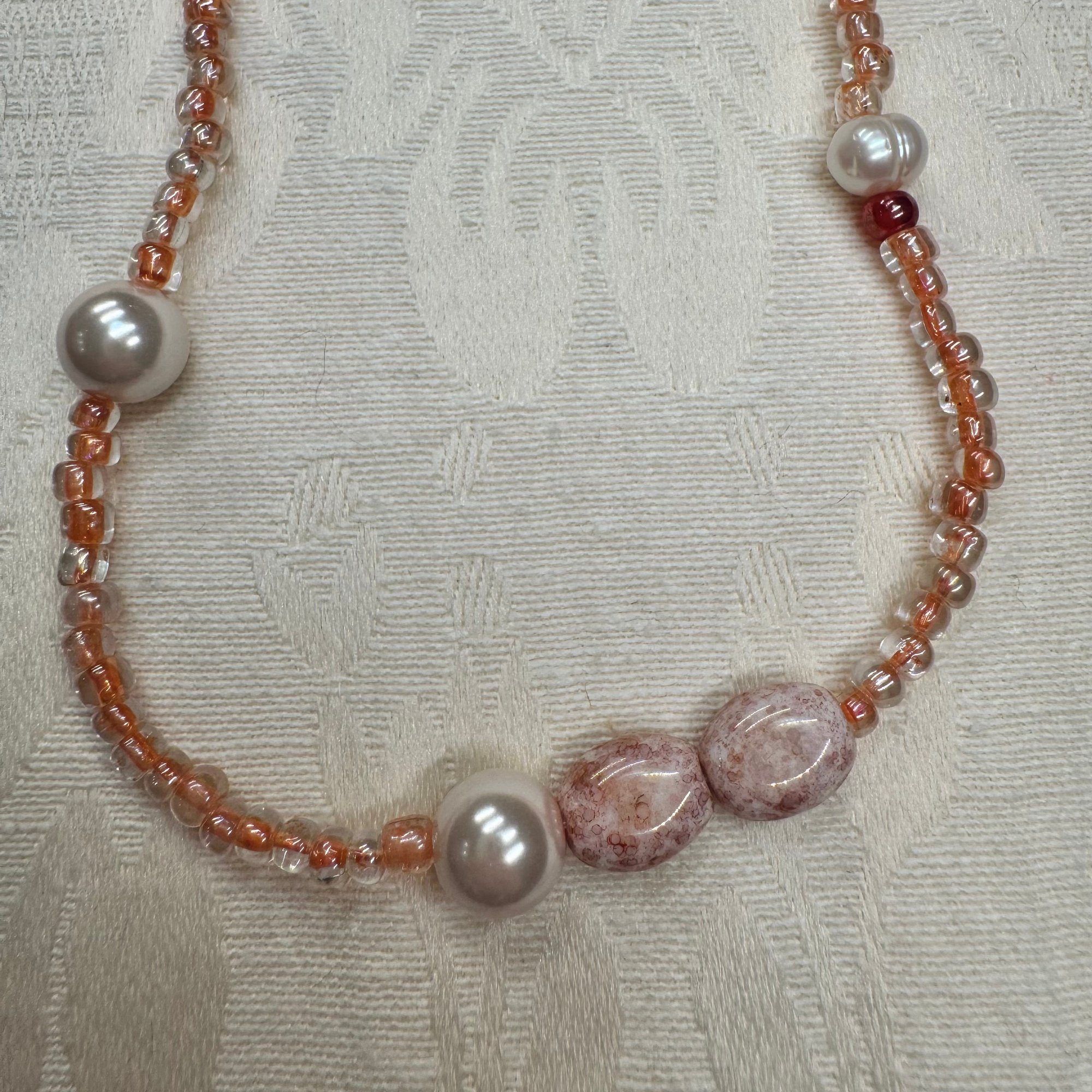16-inch necklace made with secondhand pink and red glass beads, pink pearls, and freshwater pearls.