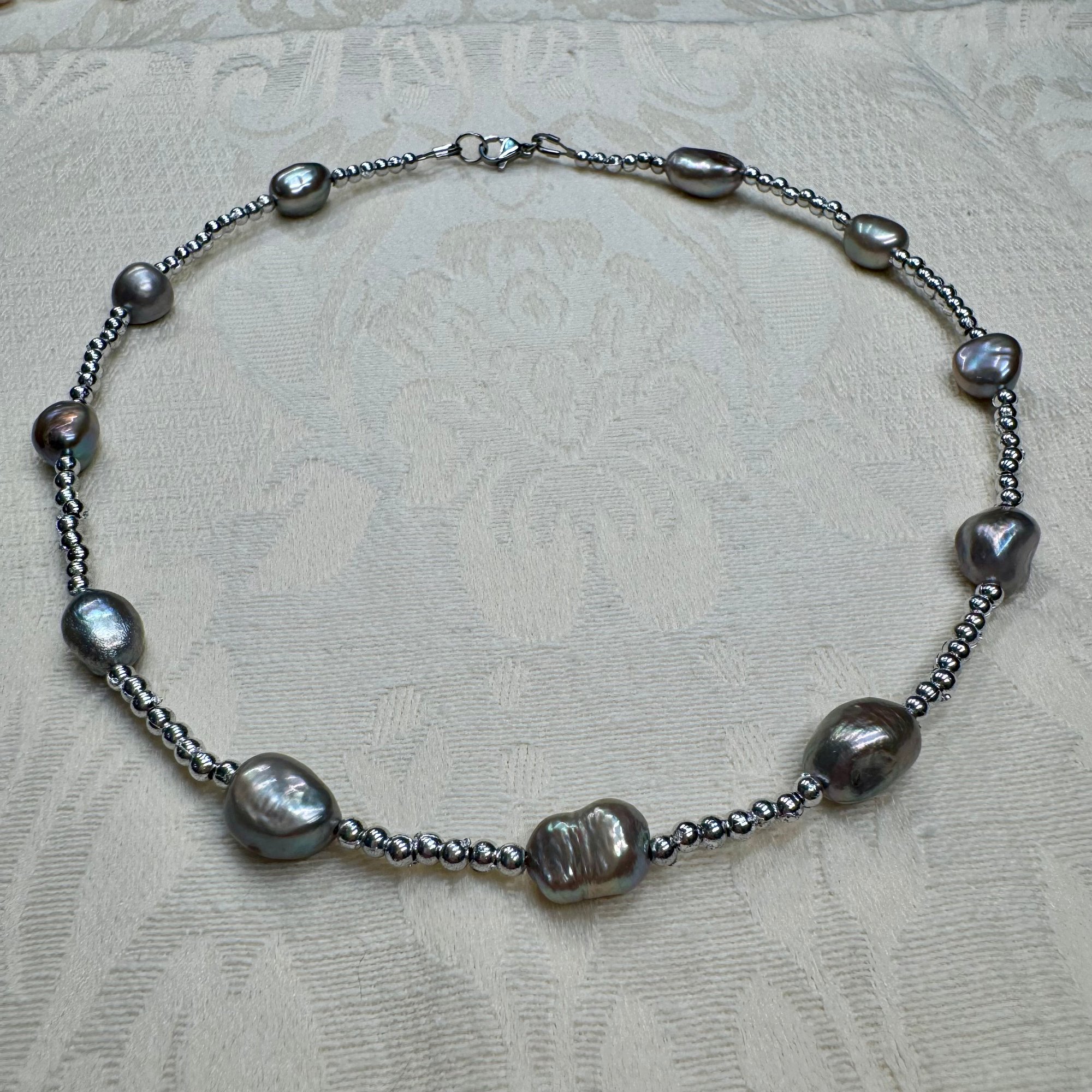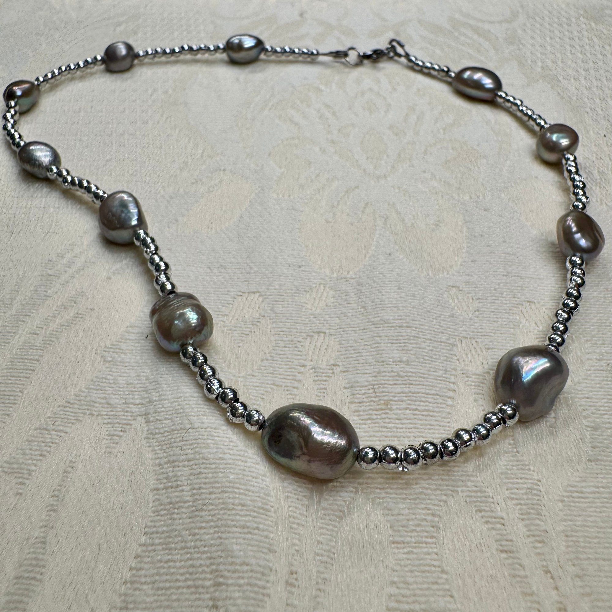 16-inch necklace made with secondhand silver seed beads and freshwater pearls.