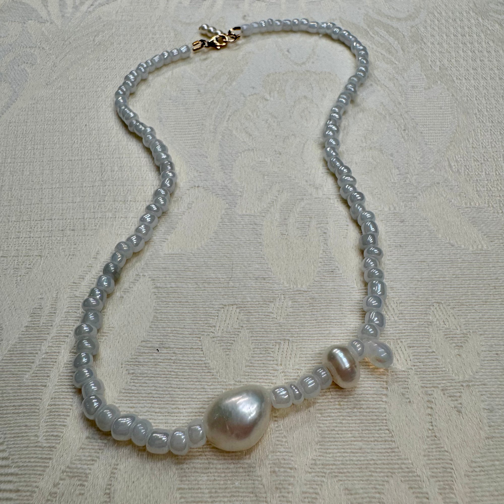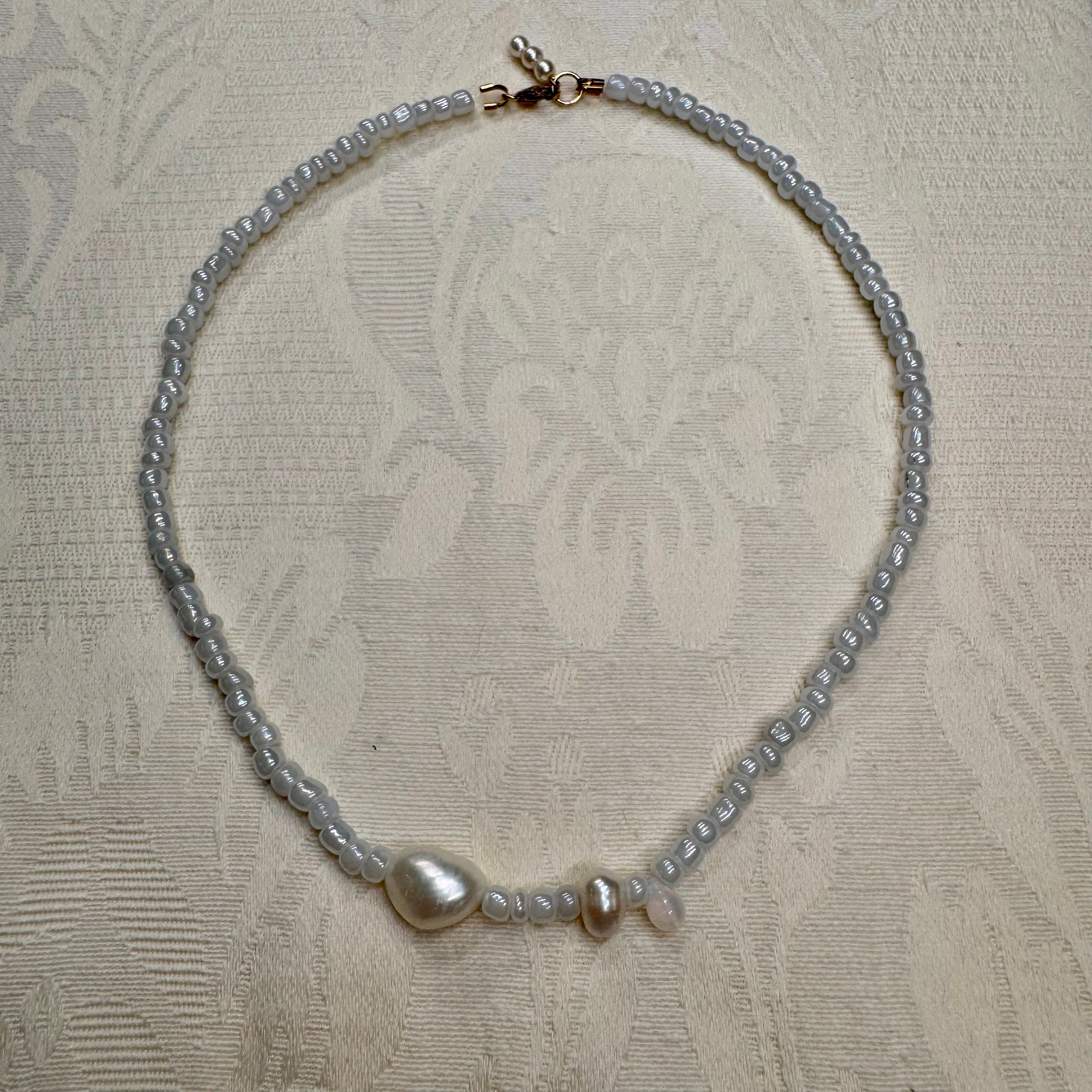 16-inch necklace made with secondhand white seed beads, opal and freshwater pearls.