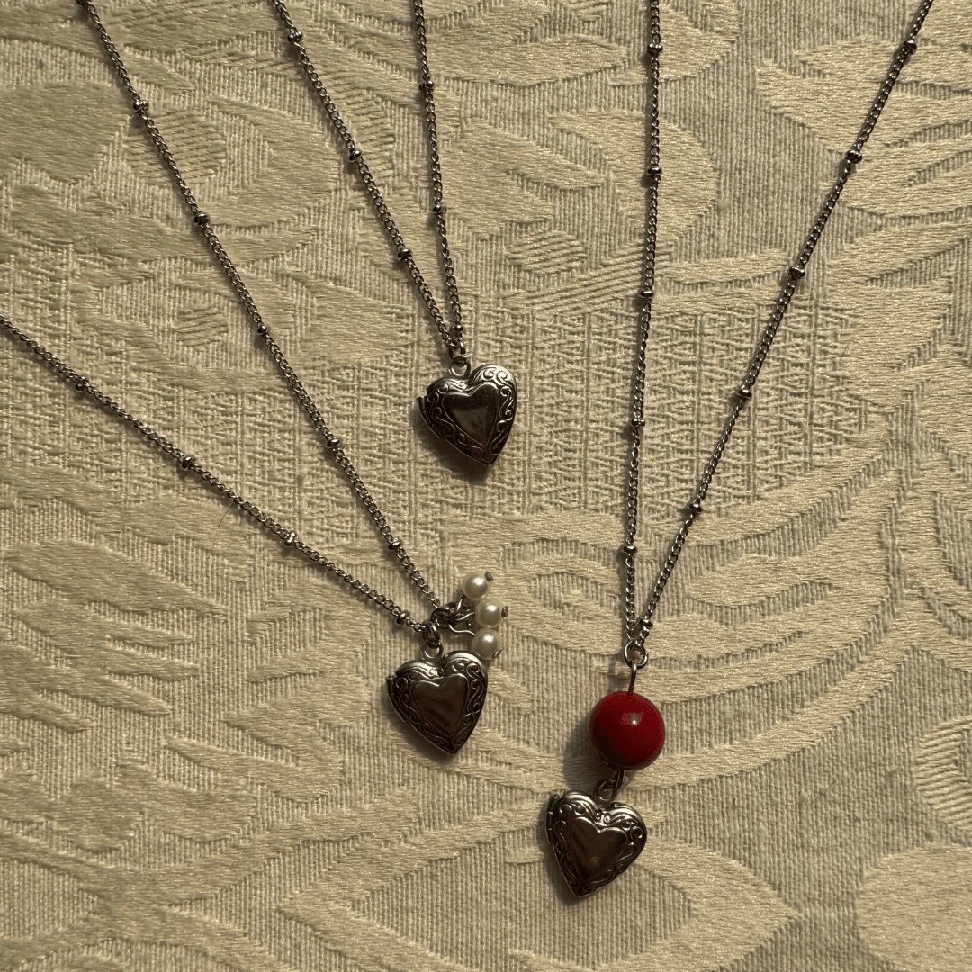 the clink locket necklace is made with a stainless steel bead chain and heart locket.