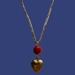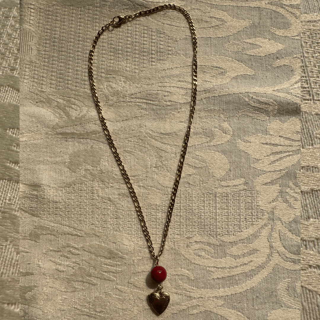 the manhattan locket features a gold figaro chain, czech red glass “cherry” bead, and a stainless steel heart locket.