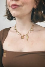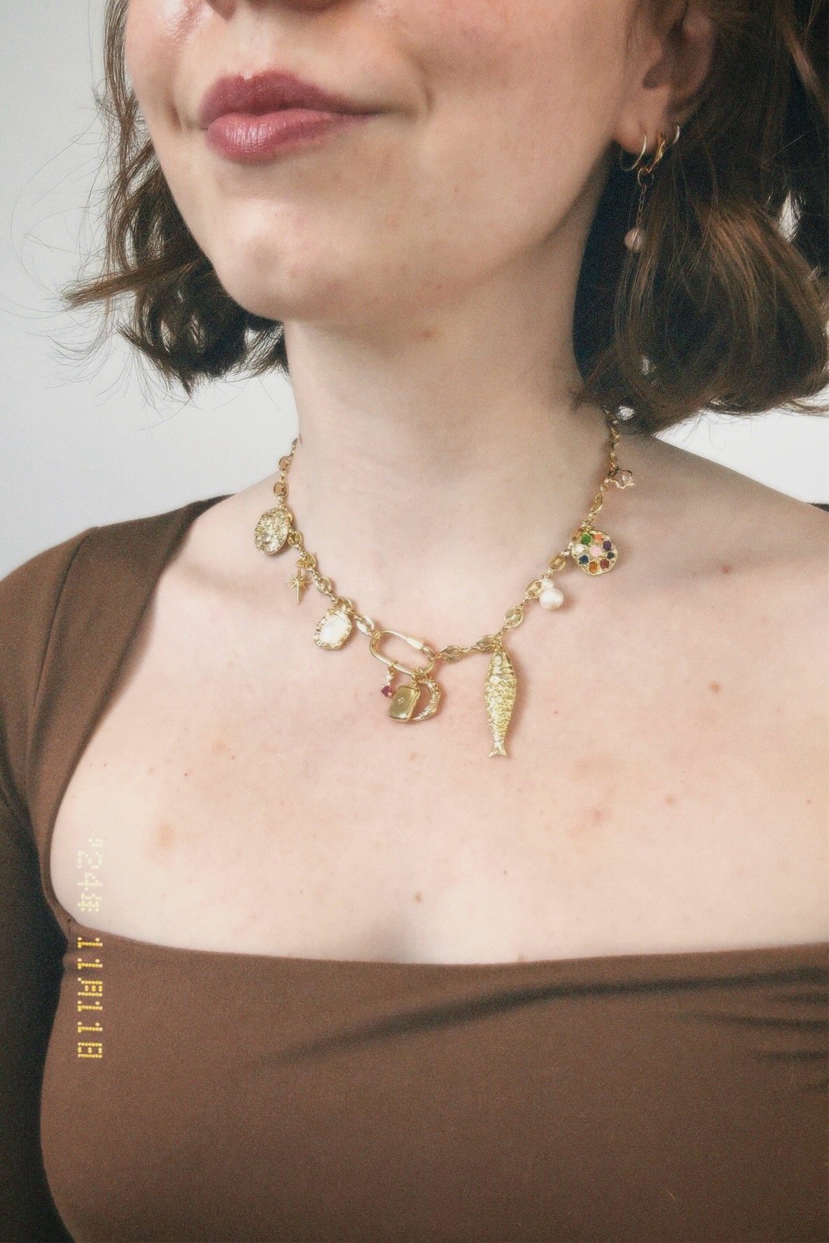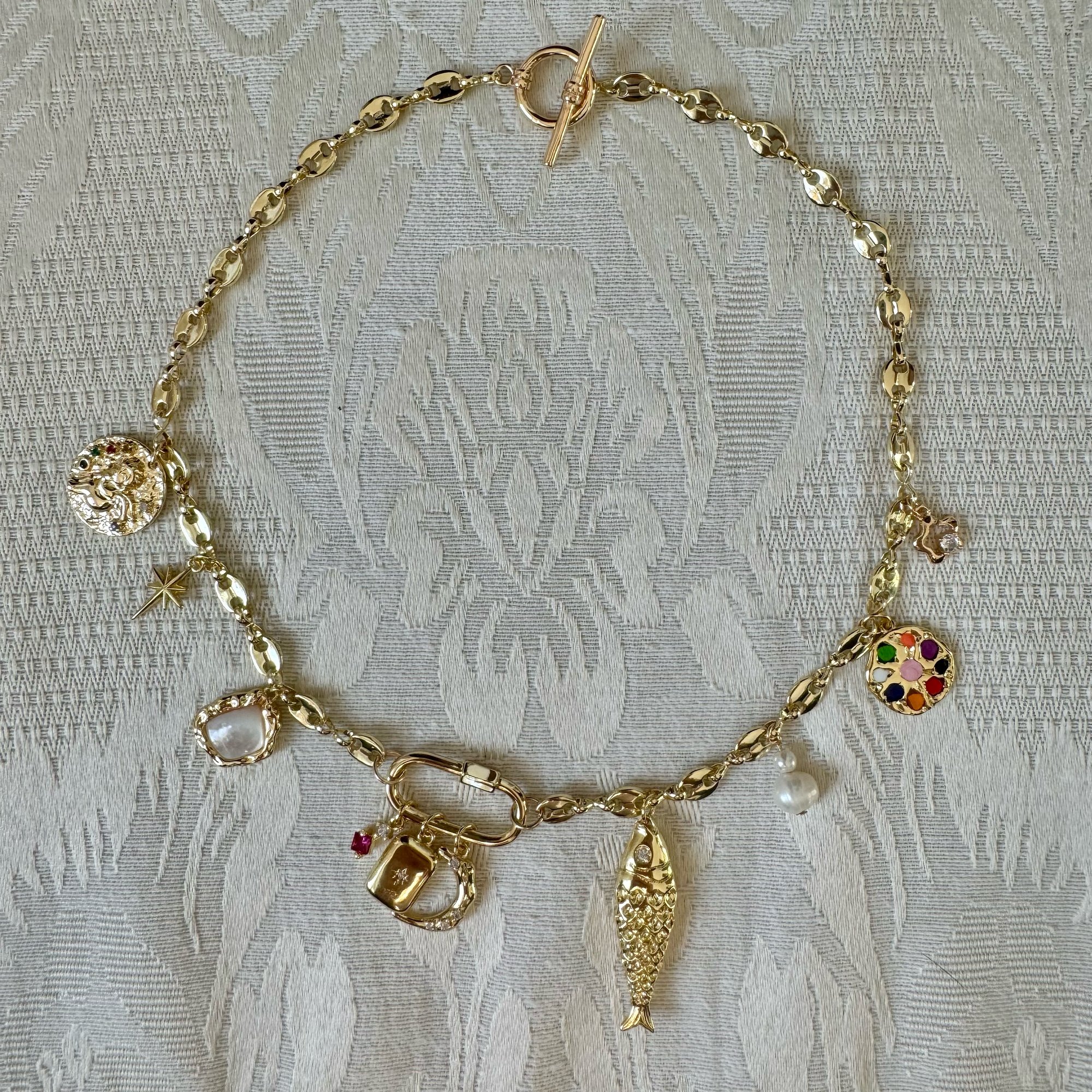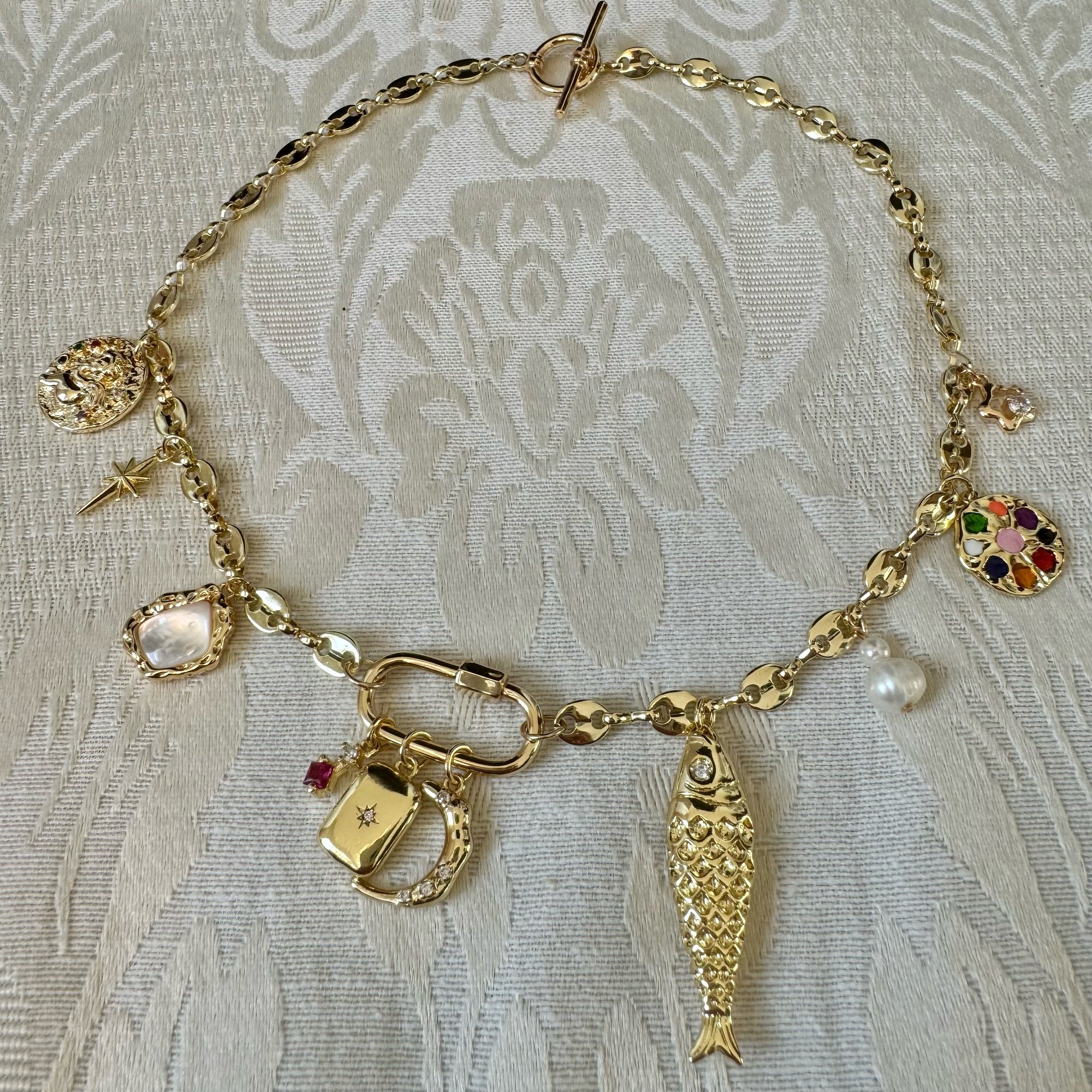 16-inch 18k gold-plated mariner chain, featuring a 14k gold-filled carabiner with star, vintage pearls, moon, fish, flower, cherub, paint palette, and cubic zirconia charms.